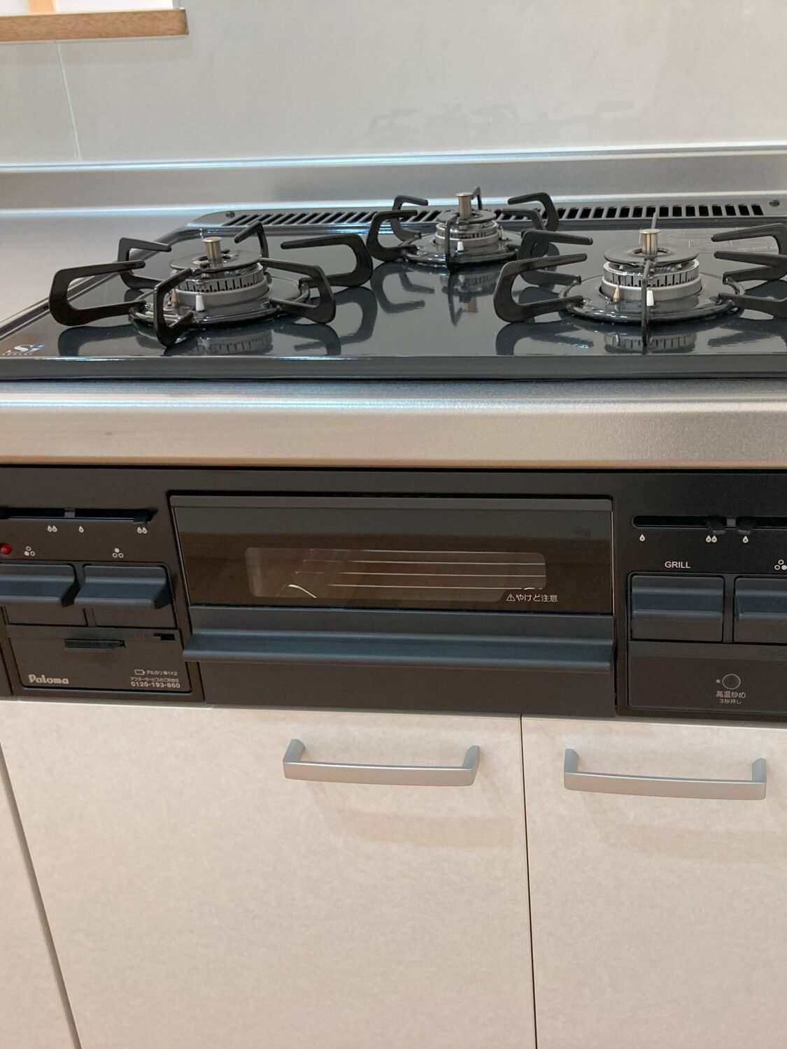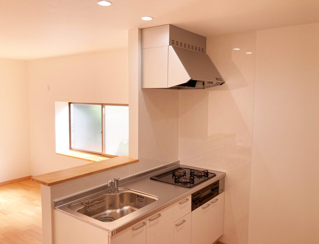 キッチンは3つ口のコンロでしっかりした換気ダクトを備えています。また、床下修理口も兼ねた収納やリビング入り口に操作パネルもついています。写真では少ししか映っていませんがリビング奥には寝室の物置スペースを生かした収納があります。