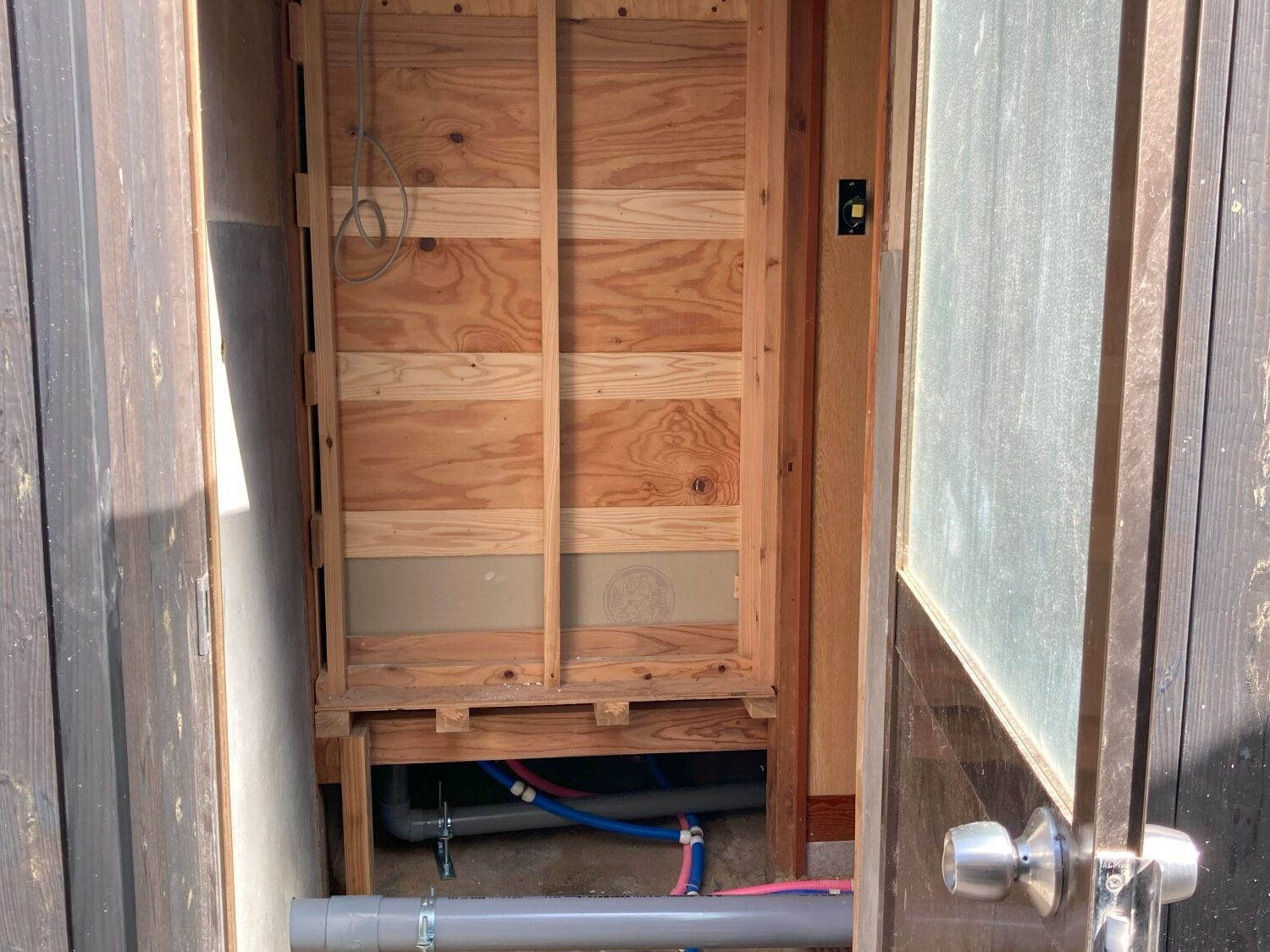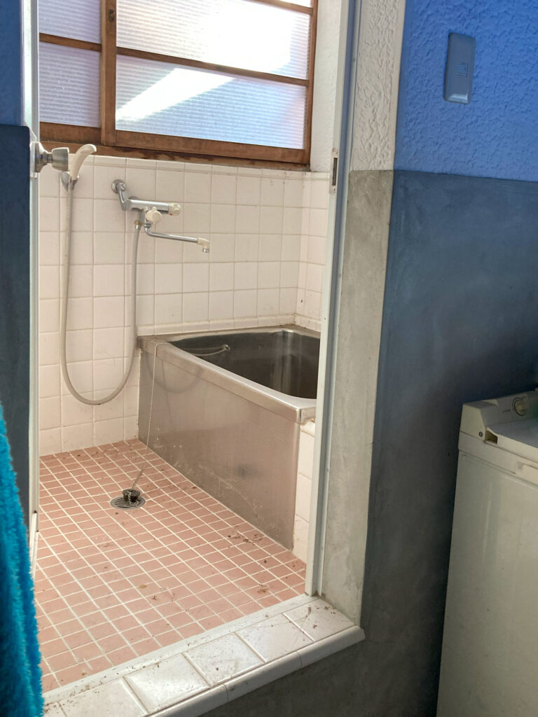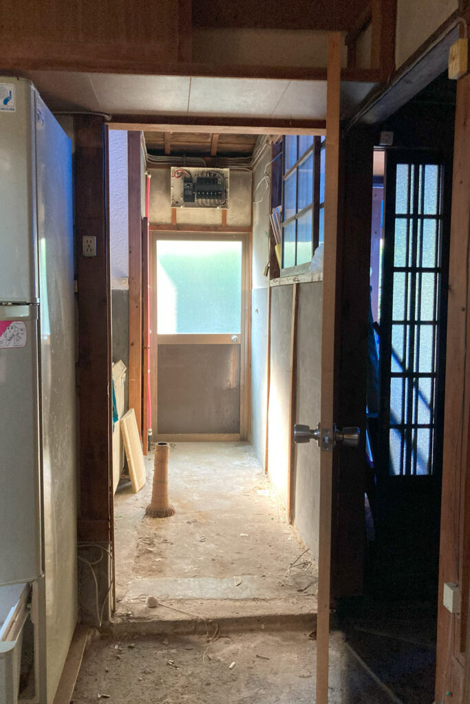 昔ながらのつくりでお風呂や水回りが玄関わきの勝手口から続く土間の廊下沿いにあって靴を脱いで水回りへ行くようなレイアウトでした。土間キッチンと、トイレ、風呂、畳の居間と寝室がありました。